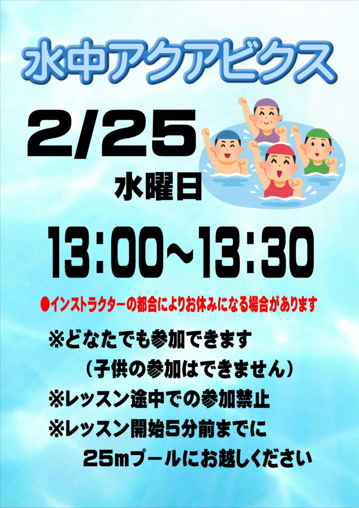 2月の「水中アクアビクス」第2回目のご案内です。 2月25日 (水) 13:00…