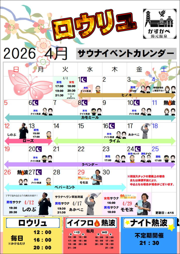 サウナ熱波倶楽部所属、拉麺清水の4月後半の熱波予定です。 ぜひ、熟練の風をご体験…