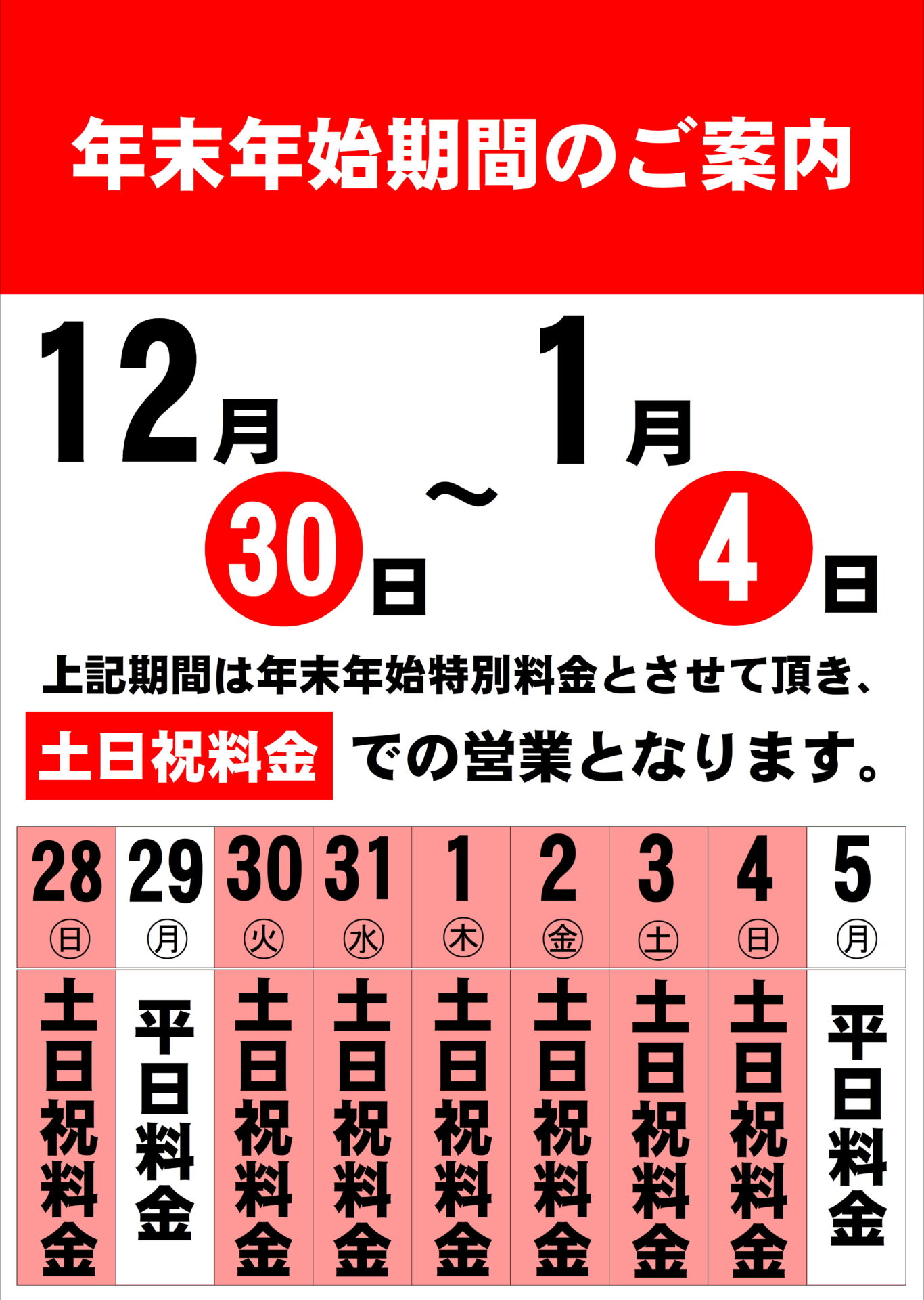 年末年始特定期間につき、12月30日~1月4日は特定料金での営業となります。