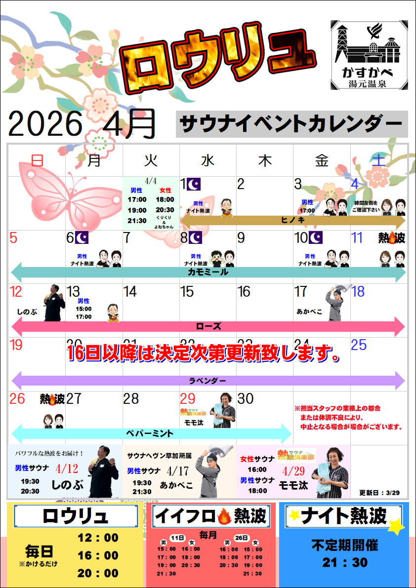開催は急遽変更となる場合があります。 当館のサウナは高温設定となっております。 …