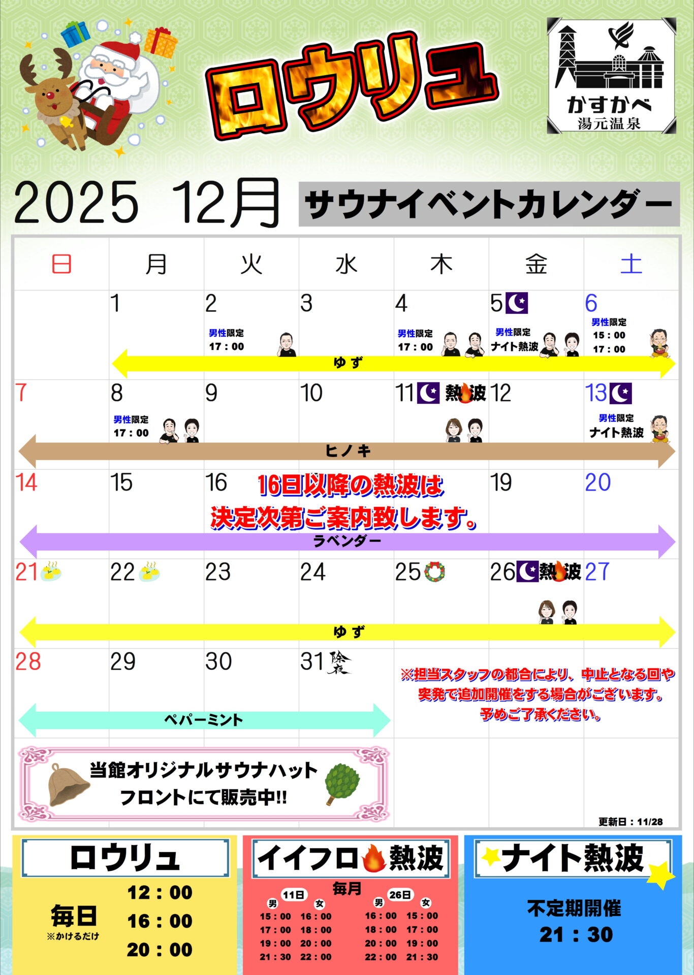 開催は急遽変更となる場合があります。 当館のサウナは高温設定となっております。 …